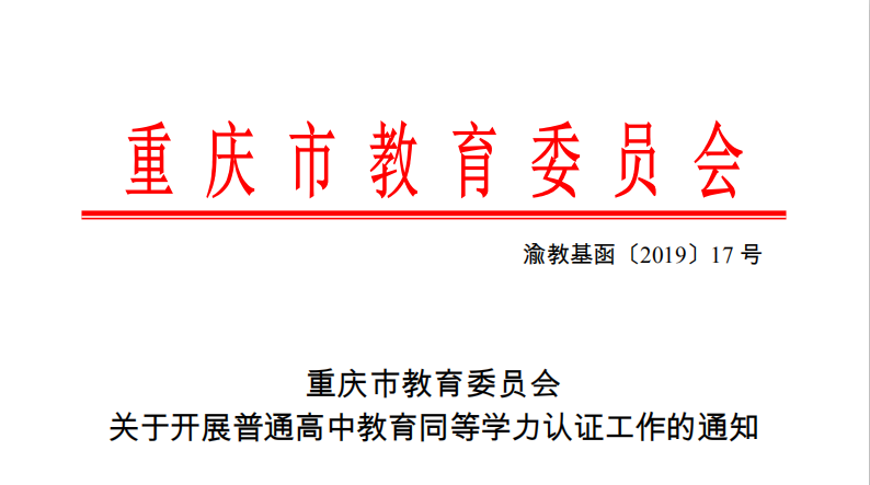 根據(jù)《重慶市人民政府關(guān)于印發(fā)重慶市深化普通高等學(xué)校招生綜合改革實施方案的通知》(渝府發(fā)〔2019〕11號)、《重慶市教育委員會關(guān)于印發(fā)普通高中學(xué)業(yè)水平考試實施方案的通知》(渝教基發(fā)〔2018〕24號)等文件精神,現(xiàn)就開展普通高中教育同等學(xué)力認(rèn)證工作有關(guān)事宜通知如下: